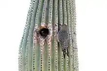 Although they do not use them immediately, waiting first for the sap to harden, Gila Woodpeckers excavate cavities in cacti and trees as nesting sites.