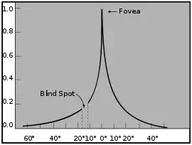يوضح الرسم البياني المجاور حساسية الشبكية للضوء في مقطع مار بالنقرة وبالبقعة العمياء؛ يبين المحور الرأسي مقدار الحساسية للضوء، ويبين ان أعلى حساسية للضوء تكون عند النقرة fovea.