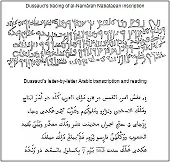 عثر المستشرقان رينيه ديسو وفريدريك ماكلر سنة 1901، على شاهد قبر مصنوع من حجر البازلت، على بعد كيلومتر من النمارة القائمة على انقاض قصر روماني شرقي جبل الدروز. وهو مكان لا يخلو من مؤثرات لغوية غير عربية، لأن النمارة تقع في بلاد الشام التي كانت تغلب عليها الآرامية.[2]