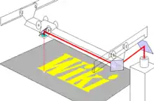 يتضمن الإعداد النموذجي لطاولة الليزر الضوء الثابت الذي ينبعث منه الليزر بالتوازي مع أحد محاور الطاولة الذي يُوجه إلى مرآة مركبة في نهاية سكة قابلة للتعديل. ينعكس الشعاع عن المرآة بزاوية 45 درجة بحيث يسير الليزر في مسار بطول السكة تمامًا. ثم ينعكس هذا الشعاع بواسطة مرآة أخرى مثبتة على عربة متحركة والتي توجه الشعاع بشكل عمودي على المحور الأصلي. في هذا المخطط، يمكن تمثيل درجتين من الحرية (رأسية وأخرى أفقية) للحفر.
