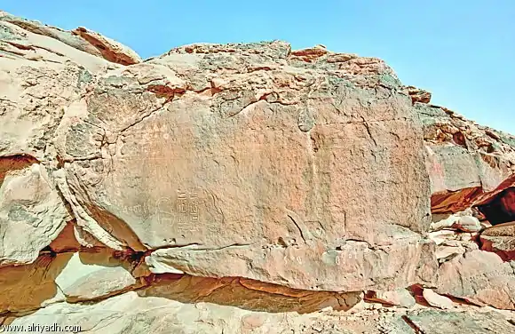 نقش تيماء الهيروغليفي عثر على هذا النقش في عام 2010 وأثار وجوده بالقرب من تيماء تساؤلاً كبيراً عن السياق الحضاري الذي يمكن أن يفسر به وجود مثل هذا الخرطوش في عمق الشمال الغربي للجزيرة العربية. ولمعرفة ذلك أجرى علماء الآثار السعوديون بحثاً ميدانياً ومكتبياً توصلوا من خلاله إلى وجود طريق تجاري مباشر يربط وادي النيل بتيماء، كان مستخدماً في عهد الفرعون رمسيس الثالث في القرن الثاني عشر قبل الميلاد، وتسير عليه القوافل المصرية للتزود من تيماء بالبضائع الثمينة التي اشتهرت بها أرض مدين مثل البخور والنحاس والذهب والفضة.