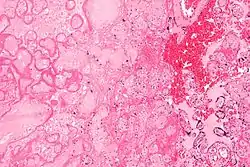 ![]() صورة مجهرية لاحتشاء المشيمة، وهو السبب هنا لنقص الأكسجين في الرحم. صبغة الهيماتوكسيلين والإيوسين صورة مجهرية لاحتشاء المشيمة، وهو السبب هنا لنقص الأكسجين في الرحم. صبغة الهيماتوكسيلين والإيوسين | |