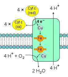 | سيتوكروم سي أوكسيديز | الفسفرة المؤكسدة، نقل الإلكترون في غشاء الميتوكوندريا | |