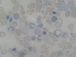 ![]() مسحة أرومة حديدية حلقية، وهي من علامات نقص النحاس في الدم. مسحة أرومة حديدية حلقية، وهي من علامات نقص النحاس في الدم. | |