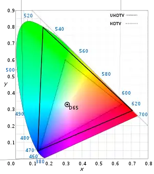 مخطط الفضاء اللوني سي آي إي 1931 والذي يظهر التوصية ذات الرقم Rec. 2020 المتعلقة بالفضاء اللوني في المثلث الأكبر؛ والتوصية Rec. 709 في المثلث الأصغر؛ وكلتاهما تعتمدان المضياء المعياري D65 كنقطة بيضاء.