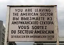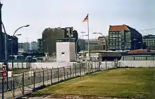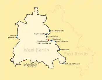 الحواجز الغربية (الأمامية) والشرقية (الخلفية) ، مع برج المراقبة الشهير الأخير ، الذي تم هدمه في عام 2000