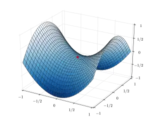 في الرياضيات ، نقطة السرج[1] أو النقطة السرجية[2] أو نقطة الحد الأدنى[3] هي نقطة على سطح الرسم البياني لدالة حيث يكون الميل (المشتقات) في اتجاهات متعامدة كلها صفر (نقطة حرجة)، ولكنها ليست نقطة قيمة حدية محلية للدالة.[4] مثال على النقطة السرجية عندما تكون هناك نقطة حرجة ذات حد أدنى نسبي على طول اتجاه محوري واحد (بين القمم) وبحد أقصى نسبي على طول محور العبور. ومع ذلك، لا يلزم أن تكون نقطة السرج في هذا الشكل. على سبيل المثال، الوظيفة لديه نقطة حرجة في هذه هي النقطة السرجية لأنها ليست الحد الأقصى النسبي أو الحد الأدنى النسبي ، ولكن ليس لديها الحد الأقصى النسبي أو الحد الأدنى النسبي في اتجاه-.