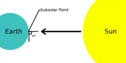 رسم تخطيطي أساسي يوضح موقع النقطة الفرعية على سطح الأرض. الزاوية بين الشمس ومستوى الأرض 90 درجة عند النقطة الفرعية