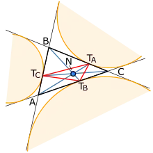 في الهندسة الرياضية، هي نقطة موجودة في أي مثلث، حيث في مثلث ABC بطول أضلاع a = |BC|، b = |CA|، c = |AB|، ليكن TA، TB، TA هي النقاط التي تتقاطع فيها الدائرة الخارجية A مع المستقيم BC، الدائرة الخارجية B مع المستقيم CA والدائرة الخارجية C مع المستقيم AB على الترتيب. تتقاطع المستقيمات ATA, BTB, CTC في نقطة N هي نقطة ناغيل.[1]