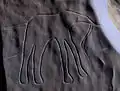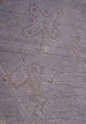 نقش على صخرة "Meerkatze" (سميت بواسطة عالم الآثارLeo Frobenius), للبؤات هائجة في منطقة حمامات ستافت، بالصحراء الليبية