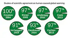 - Painter & Ashe 2012: "Despite a high degree of consensus amongst publishing climate researchers that global warming is occurring, and that it is anthropogenic, this discourse, promoted largely by non-scientists, has had a significant impact on public perceptions of the issue, fostering the impression that elite opinion is divided as to the nature and extent of the threat."