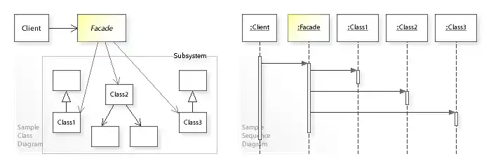 في الرسم التخطيطي لصنف UML أعلاه، لا يصل صنف Client إلى أصناف النظام الفرعي مباشرة. بدلاً من ذلك، يعمل العميل Client من خلال صنف الواجهة Facade التي تطبق واجهة بسيطة من حيث (عن طريق التفويض إلى) أصناف النظام الفرعي ( Class1 و Class2 و Class3 ). يعتمد Client فقط على واجهة Facade البسيطة وهو مستقل عن النظام الفرعي المعقد. يعرض الرسم التخطيطي للتسلسل تفاعلات وقت التشغيل: يعمل كائن عميل Client خلال كائن واجهة Facade الذي يفوض الطلب إلى مثيلات الأصناف التالية Class1 و Class2 و Class3 التي تقوم بتنفيذ الطلب.