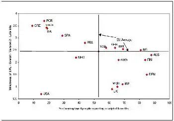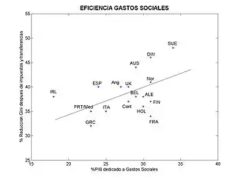 وفي هذه الحالة، يظهر الرسم البياني على اليمين أن نموذجي الأنجلو سكسون والشمال أكثر كفاءة من النموذج القاري أو نموذج البحر الأبيض المتوسط. ويبدو أن النموذج القاري هو الأقل كفاءة. ونظرًا للمستوى المرتفع من النفقات الاجتماعية، على المرء أن يتوقع ارتفاع مستوى الحد من الفقر مقارنة بتلك التي حققها هذا النموذج. لاحظ كيف يوجد نموذج الأنجلو سكسون فوق خط المتوسط، بينما يوجد النموذج القاري أدنى هذا الخط.