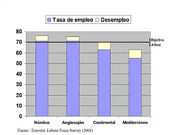 وفي هذه الحالة، يظهر الرسم البياني أن البلدان في نموذج الشمال والأنجلو سكسون قد حققت أعلى معدل للعمل، في حين أن البلدان القارية والمتوسطية لم يحققوا هدف إستراتيجية لشبونة.