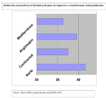 يظهر الرسم البياني على الجهة اليسرى التراجع في عدم المساواة (مقيسة بمؤشر جيني) بعد الأخذ في الاعتبار الضرائب والتحويلات، أي، إلى أي مدى يقلل كل نموذج اجتماعي من الفقر دون الأخذ بعين الاعتبار الحد من الفقر الذي حفزته الضرائب والتحويلات. ويعد مستوى النفقات الاجتماعية مؤشرًا على قدرة كل نموذج على الحد من الفقر: ترتبط الحصة الأكبر من النفقات بشكل عام بنسبة التراجع المرتفعة في الفقر. ومع ذلك، فثمة جانب آخر ينبغي أن يؤخذ في الاعتبار وهو الكفاءة في الحد من الفقر. وهذا يعني أنه بحصة أقل من النفقات، يمكننا الحد من ارتفاع نسبة الفقر.