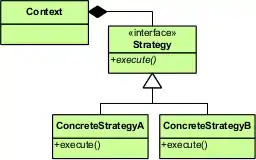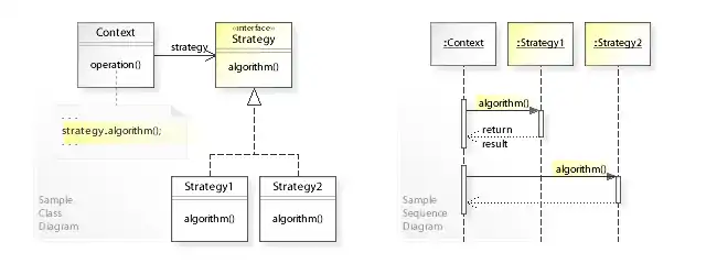 .في مخطط الصنف UML (بالإنجليزية: UML class diagram) أعلاه، لا يطبق صنف السياق (بالإنجليزية: Context class) خوارزمية مباشرة. بدلاً من ذلك، يشير السياقContext إلى واجهة الإستراتيجية Strategy interface لتنفيذ خوارزمية (()Strategy.algorithm ) ، مما يجعل السياقContext مستقلاً عن كيفية تطبيق (بالإنجليزية: implemented) الخوارزمية. صنفا الإستراتيجيةStrategy1 (بالإنجليزية: Strategy1) والاستراتيجية 2 (بالإنجليزية: Strategy2) ينفذا (بالإنجليزية: implement) واجهة الإستراتيجية (بالإنجليزية: Strategy interface)، أي تنفيذ (تغليف) (بالإنجليزية: implement (encapsulate)) خوارزمية. يعرض مخطط التتابع UML (بالإنجليزية: UML sequence diagram) تفاعلات وقت التشغيل (بالإنجليزية: run-time interactions) : يقوم كائن السياق (بالإنجليزية: Context object) بتفويض (بالإنجليزية: delegates) خوارزمية لكائنات إستراتيجية (بالإنجليزية: Strategy objects) مختلفة. أولاً، يستدعيContext السياق خوارزمية ()algorithm على كائن Strategy1 ، الذي ينفذ الخوارزمية ويعيدreturns النتيجة إلى السياقContext. بعد ذلك، يغير السياقContext استراتيجيته ويستدعي ()algorithm على كائن Strategy2 ، الذي ينفذ الخوارزمية ويعيد (بالإنجليزية: returns) النتيجة إلى السياق(بالإنجليزية: Context).