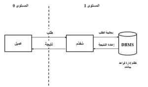 - بُنيّة ثُنائيّة المُستويات (بالإنجليزية: Two-Tiers Architecture): وهو أبسط بُنية لنموذج طلب الخدمة، وفيه يتوزّع العمل بين مُخدّم وعدد من العُملاء، يضمّ خادم المُخدّم قاعدة بيانات خاصّة بالخدمة التي يُقدمّها. بشكلٍ عام، يجب على كل عميل ينفذ إلى قاعدة البيانات. عبر طلب يُقدّم إلى المُخدّم الذي يُعالج الطلبات، من سلبيات هذه البُنية محدوديّة عدد العُملاء الذين يُمكن للمُخدم دعمُهم، بالإضافة لوجود إشكالات أمنيّة بسبب حاجة كل عميل للنفاذ بشكلٍ مُستقل إلى قاعدة البيانات.[12]