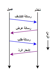 - تصل رسالة العرض إلى العميل، فيقوم بطلب معلومات التهيئة من المُخدّم عن طريق رسالة طلب.