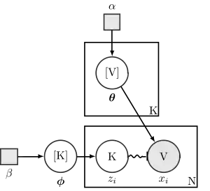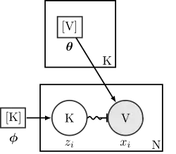 - N المتغيرات الكامنة العشوائية التي تحدد هوية مكون الخليط لكل ملاحظة، يتم توزيع كل منها وفقًا لتوزيع فئوي الأبعاد K