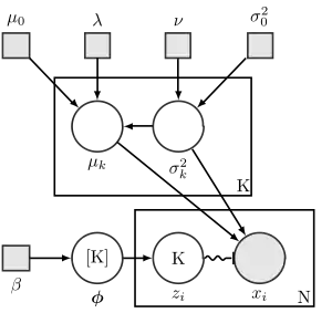 - N المتغيرات العشوائية التي يتم ملاحظتها، يتم توزيع كل منها وفقًا لمزيج من مكونات K ، مع المكونات التي تنتمي إلى نفس المجموعة البارامترية للتوزيع (على سبيل المثال، كل عادي ، كل Zipfian ، وما إلى ذلك) ولكن مع معلمات مختلفة