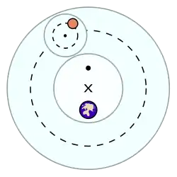 في النظام البطلمي، يتحرك كل كوكب من خلال نظام يحتوي على مدارين أو أكثر: الأول يطلق عليه ناقل، في حين يطلق على المدارات الأخرى اسم فلك التدوير. والناقل عبارة عن دائرة توجد النقطة المركزية فيها في منتصف الطريق بين الإكوانت والأرض، ويشار إليها بالعلامة X في الصورة إلى اليسار، حيث تكون الإكوانت هي النقطة الصلبة المقابلة للأرض. وهناك مدار آخر، وهو فلك التدوير وهو مضمن في الناقل، ويشار إليه بالخط الأصغر المنقط في الصورة الموجودة إلى اليسار. وبالتالي، فإن أي كوكب يتحرك عبر فلك التدوير في نفس الوقت الذي يتحرك فيه فلك التدوير حول المسار الذي يميزه الناقل. وهاتان الحركتان معًا تسببان حركة الكوكب المحدد بشكل أقرب من الأرض أو أبعد عنها في نقاط مختلفة في تلك المدارات، مما جعل المراقبين يعتقدون أن الكوكب يبطئ الحركة ويتوقف ويتحرك للخلف (في شكل حركة تراجعية). وقد كانت تلك الحركة التراجعية واحدة من أكثر نقاط الاختلاف في الأنظمة الكونية اليونانية، وكانت أحد الأسباب الرئيسية التي جعلت بطليموس يتجه نحو نموذج أفلاك التدوير. ويعد نموذج أفلاك التدوير في الواقع نموذجًا رائعًا للمدار البيضاوي ذي الانحراف المنخفض، والذي تكون السمة الرئيسية فيه هي التركيز على الإزاحة. ولا يبدو أن شكل القطع الناقص الشهير للغاية نطاق ملحوظ عندما يكون الانحراف أقل من 5%، إلا أن مسافة إزاحة "المركز" (في الواقع ينصب التركيز على الشمس) تكون ملحوظة للغاية حتى في حالات الانحراف المنخفضة التي تمتلكها الكواكب.