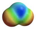 مثال ثلاثي الأبعاد، لنموذج ملء الفراغ من جزيء بسيط، ثاني أكسيد الكبريت، SO2، وتبين الكمون الكهربائي، المحسوب للجزيء باستخدام برمجيات من أدوات الكيمياء الحاسوبية، مظللة باللون الأزرق للمناطق موجبة الشحنة، إلى اللون الأحمر للمناطق سالبة الشحنة. تم إنشاء السطح عن طريق حساب طاقة التفاعل مع شحنة موجبة على صورة نقطة كروية (على سبيل المثال، بروتون، H+،) مع ذرات الجزيء والإلكترونات الرابطة، في سلسلة من الخطوات الحسابية المنفصلة. هنا، يؤكد السطح الكهربائي نقص الإلكترونات في ذرة الكبريت، مما يشير إلى التفاعلات الكيميائية التي قد تشارك فيها.