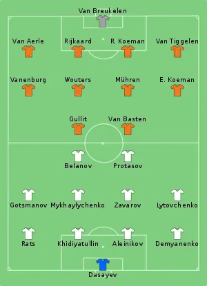 فاز المنتخب الهولندي في المباراة بنتيجة 2-0، وقد سجل رود خوليت الهدف الأول للطواحين من ضربة رأس في الدقيقة من الشوط الأول، بينما أضاف زميله ماركو فان باستن الهدف الثاني في الدقيقة من الشوط الثاني. يذكر أن الحارس الهولندي هانس فان بروكيلين قد تصدى لركلة جزاء، نفذها اللاعب السوفييتي إيغور بيلانوف، بعدما تم عرقلة اللاعب السوفييتي سيرجي غوتسمانوف.[2]