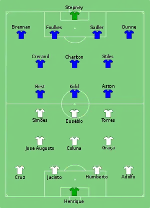 مرّ الشوط الأول كاملاً بنتيجة سلبيّة دون أية أحداث. وفي الشوط الثاني بعد ثمانية دقائق افتتح بوبي تشارلتون التسجيل في كرة رأسية. صمد بعد ذلك مانشستر يونايتد لمدة 22 دقيقة قبل أن يرد بنفيكا بهدف خايمي غراسا بعد تسديدة قوية سكنت الزاوية اليسرى للمرمى. بعد ذلك تصدى حارس مانشستر يونايتد لكرة قوية من أوزيبيو الذي أشاد الأخير للتصدي الرائع. ظلت النتيجة 1-1 حتى نهاية الوقت الاصلي، مما اضطر بالمباراة إلى التوجه للأشواط الإضافية. درجة الحرارة في لندن كان عاملاً أساسياً في التأثير على عامل اللياقة لدى لاعبي بنفيكا، وكان ذلك واضحاً من البداية حيث استطاع جو ج بيست في الدقيقة الثالثة من تسجيل الهدف الثاني بعد أن راوغ حارس المرمى وأسكنها في الشباك. واستطاع برين كيد الذي كان يحتفل في عيد ميلاه الـ 19 من إمضاء الهدف الثالث بعد أن سدد الكرة في رأسه في المرة الأولى وتصدى لها الحارس ثم ارتدت مرة أخرى له ليُسددها برأسه مرة أخرى ويُسكنها الشباك. واختتم بوبي تشارلتون مهرجان الأهداف قبل نهاية الشوط الإضافي الأول بستة دقائق بتسديدة من زاوية صعبة سكنت أعلى يمين حارس النادي البرتغالي.