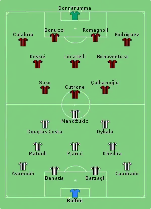 فاز يوفنتوس بالمباراة بنتيجة 4–0، ليتوج باللقب للمرة الرابع على التوالي والـ13 في تاريخ.[3] وكانت هذه هي المرة الخامسة التي يلتقي فيها الفريقان في نهائي كأس إيطاليا، حيث فاز يوفنتوس في 1942، 1990 و2016، وأما ميلان في نهائي 1973.[3][4][5]