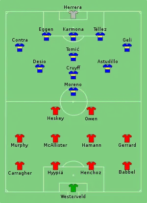 اختار ليفربول اختار تشكيلة 4-4-2 وهي نفسها التي خاض بها كأس الاتحاد الإنجليزي قبل أربعة أيام باستثناء تغيير واحد وهو إدراج غاري مكأليستر على حساب فلاديمير شميتسر، كما تم وضع روبي فاولر مرة أخرى على مقاعد البدلاء، وقد تكلف كل من إيميل هيسكي ومايكل أوين بقيادة خط الهجوم. في المقابل لعب ألافيس بتشكيلة 5-3-2 مع كوزمين كونترا، دان إيغن، أنطونيو كارمونا، أوسكار تيليز، ثم ديلفي جيلي في الدفاع؛ أما الهجوم فقد ضمّ كل من مارتين أستديلو ويوردي كرويف الذي تم اختياره للعب خلف المهاجم الوحيد خافير مورينو.[4]