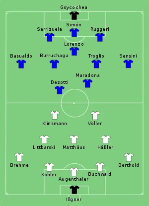 أُقيمت المباراة بتاريخ 8 يوليو 1990 في العاصمة الإيطالية روما ، وجمعت منتخبيّ ألمانيا الغربية والأرجنتين، وكان المنتخب الأرجنتيني بقيادة دييغو أرماندو مارادونا والذي توج سابقا لكأس العالم في المكسيك ضمن التشكيلة الأساسية، فازت ألمانيا الغربية على الأرجنتين بنتيجة 1-0 جاء الهدف من ضربة جزاء إحتسبها الحكم في أواخر الشوط الثاني من عمر المباراة.