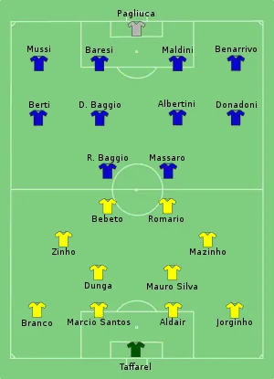 هذا اللقاء يعتبرالثاني بين المنتخبين في إحدى المباريات النهائية لكأس العالم بعد مونديال 1970 ، كررت البرازيل الفوز على إيطاليا بضربات الجزاء الترجيحية، ونالت البرازيل لقبها المونديالي الرابع.