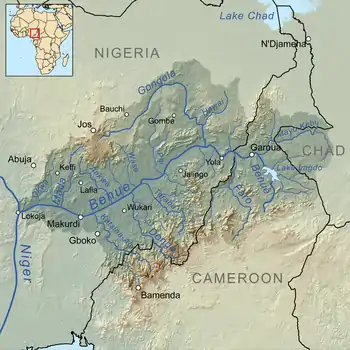 ترتفع في هضبة أداماوا في شمال الكاميرون، حيث تتدفق غربًا، وعبر بلدة جاروا ولاجدو، إلى نيجيريا جنوب جبال ماندارا، وعبر جيميتا وإيبي وماكوردي قبل أن تلتقي بنهر النيجر في لوكوجا.