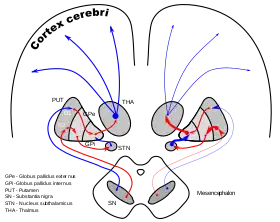 ![]() شرائح إكليلية في الدماغ البشري تظهر العقد القاعدية، نواة أسفل المهاد (STN) والمادة السوداء (SN). | |