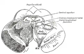 ![]() مقطع عرضي في الدماغ المتوسط يُظهر موقع النواة الحمراء. الأكيمة العلوية في أعلى الصورة أما السويقة الدماغية ففي أسفل الصورة. | |