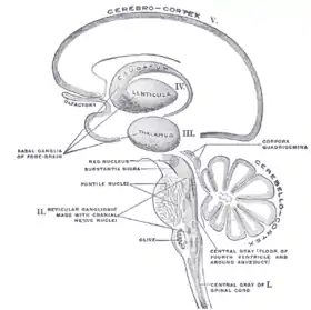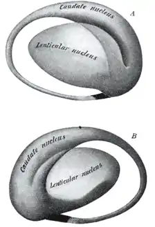 ![]() مظهرين لنموذج من الجسم المخطط (على الجانب الأيمن من الدماغ): A، الجانب الوحشي. B، الجانب الإنسي. | |