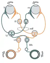 ![]() تمثيل تخطيطي للنواة المحركة للعين، مشهد ظهري. النوى الحركية بالأحمر، والحسية بالأزرق تمثيل تخطيطي للنواة المحركة للعين، مشهد ظهري. النوى الحركية بالأحمر، والحسية بالأزرق | |