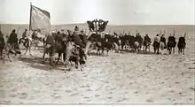يقول موسى الرويلي (ألويس موزيل) يصف هذه الراية: لقد جاء -أي الأمير نواف- لزيارة والده، ويصحبه مئات من المحاربين على الجمال وهم يحملون في مقدمة صفوفهم علما غريباً مميزاً(بيرق). إلى حربة طويلة مزينة بريش النعام، وكانت قطعة من قماش أسود مخاط عليها شكل سيف من قماش أبيض موشّى في شكل متقاطع بالكلمات:لا إله إلا الله محمد رسول الله [6]