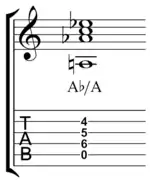 لا♭/لا (أو "لا كبيرة♭/لا بيس") ممثلة في التدوين العادي (فوق) وتدوين موضع الأصابع (أسفل)