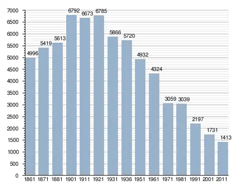 في سنة 1861 بلغ عدد السكان 4٬996 نسمة، وتطور العدد ليصل في سنة 2011 لـ 1٬413 نسمة.