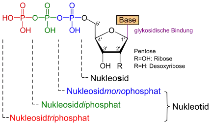 قاعدة النوكليوتيد إما أن تكون بورين أو بيريميدين. الأحماض النووية هي بوليمرات مكونة من مونومرات النوكليوتيدات، وقواعد البورين هي أدينين وغوانين. اما قواعد بيريميدين فهي ثيمين وسيتوزين وذلك في الدنا . أما الرنا فيستبدل الثيمين باليوراسيل.