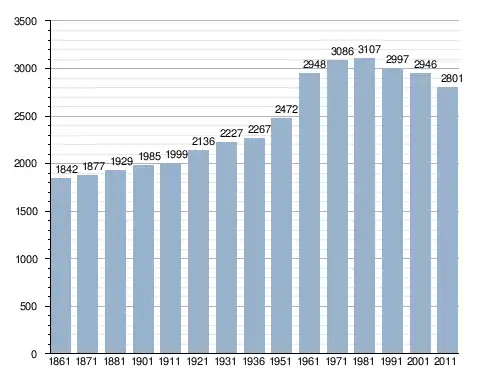 في سنة 1861 بلغ عدد السكان 1٬842 نسمة، وتطور العدد ليصل في سنة 2011 لـ 2٬801 نسمة.