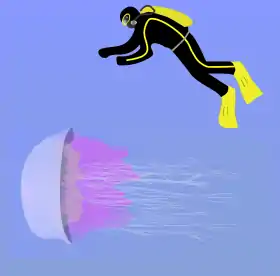 ![]() Size comparison of a Nomura's jellyfish next to a diver Size comparison of a Nomura's jellyfish next to a diver | |