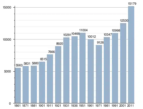 في سنة 1861 بلغ عدد السكان 5٬563 نسمة، وتطور العدد ليصل في سنة 2011 لـ 15٬179 نسمة.