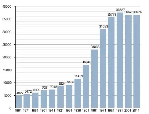 في سنة 1861 بلغ عدد السكان 4٬827 نسمة، وتطور العدد ليصل في سنة 2011 لـ 36٬674 نسمة.