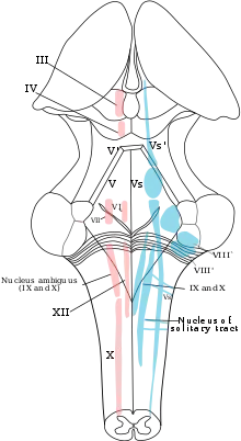 ![]() مخطَّط يُمثِّل نِوَى الأعصاب القحفيّة، منظر ظهري. اللون الأحمر يُمثِّلُ النزى المُحرِّكة و اللون الأزرق يمثِّل النوى الحسيّة (لم يتم تمثيل المراكز الشميّة و البصريّة) | |