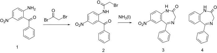 التفاعل بين 2-أمينو-5-نيتروبنزوديازيبين (1)مع بروموأسيتيل بروميد يُكّون حلقة مغلقة و2-أميد في أمونيا سائلة وينتج نيترازيبام (3) ببساطة أكثر (4) يمكن أن تتم نيترة ديازيبينون مباشرة على الكربونة النشطة رقم 7 مع نترات البوتاسيوم وحمض الكبريتيك.
