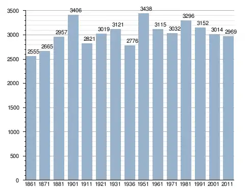 في سنة 1861 بلغ عدد السكان 2٬555 نسمة، وتطور العدد ليصل في سنة 2011 لـ 2٬969 نسمة.