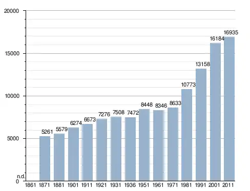 في سنة 1871 بلغ عدد السكان 5٬261 نسمة، وتطور العدد ليصل في سنة 2011 لـ 16٬935 نسمة.