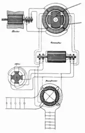 في سنة 1887 م، طوّر تسلا محرك حثي يعمل بالتيار المتردد، وهو نظام الطاقة الذي بدأ استخدامه في أوروبا والولايات المتحدة لمميزاته في نقل تيار الجهد العالي المتردد لمسافات طويلة. استخدم المحرك تيارًا متعدد الأطوار ينتج حقل مغناطيسي دوار لتشغيل المحرك.[76][77][78] حصل تسلا على براءة اختراع هذا المحرك الكهربائي المبتكر في مايو 1888 م، وهو المحرك صُمم ليعمل ذاتيًا ببساطة دون الحاجة إلى مبادل كهربائي، وبالتالي لا يحتاج إلى إنتاج شرارة انطلاق ولا يحتاج للصيانة الدورية لاستبدال الفرش الميكانيكية.[79][80]